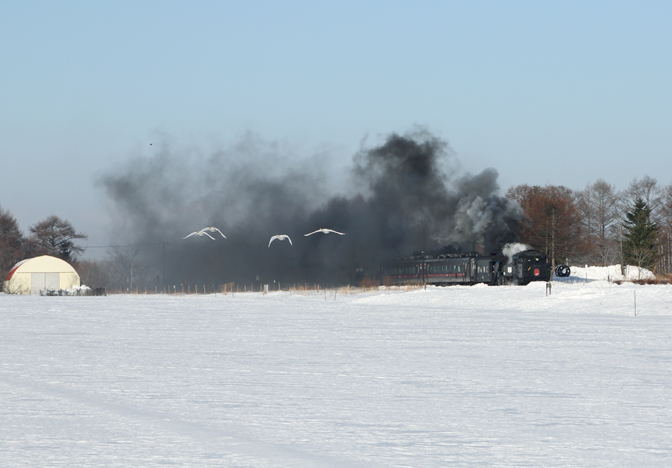 鶴とSLのツーショットも全く運次第ですが、うまい具合に4羽いてくれました。