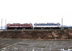 先に重連の上り貨物列車が来ましたが、国鉄色にはJR貨物の宣伝が描かれていました。