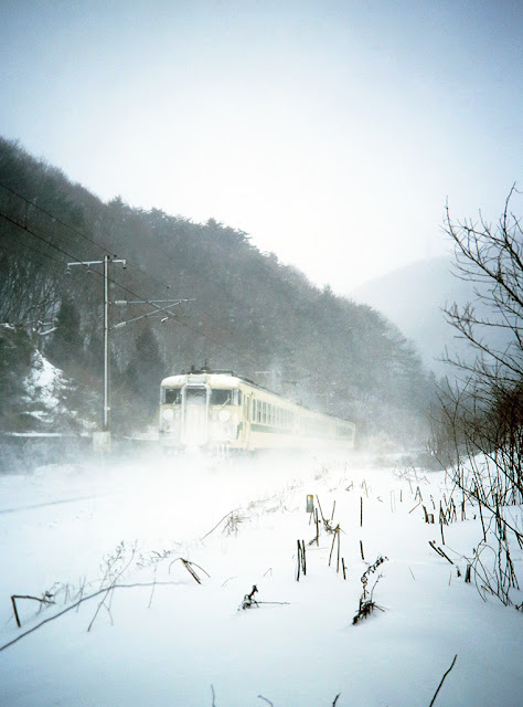 上り普通電車が、雪を巻き上げながら通過して行きました。